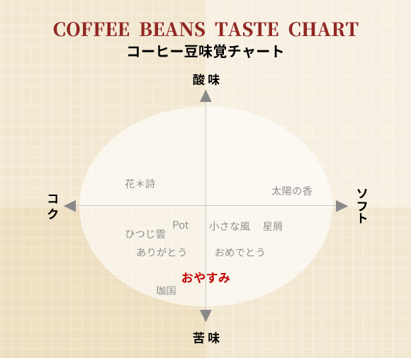 | コーヒー豆の保存方法 | コーヒー豆は光・熱・湿気を嫌います。お買い上げ後はなるべく、密封になる容器(密封缶・密封ビン・タッパー等)に袋のまま入れて、冷暗所(冷蔵庫・冷凍庫等)で保管してください。また、Beans Potでは賞味期限を2ヶ月としていますが、お買い上げ後なるべく早めにお召上がりいただくほど味わい、香り、風味をお楽しみいただけます。 目安として、粉の状態で2週間以内、豆の状態で1ヶ月以内でお召上がり下さい。尚、ここでの賞味期限・飲み頃の目安等は、Beans Potの焙煎技術により推奨するものであって、一般的なコーヒー豆の賞味期限を示すものではありません。 |