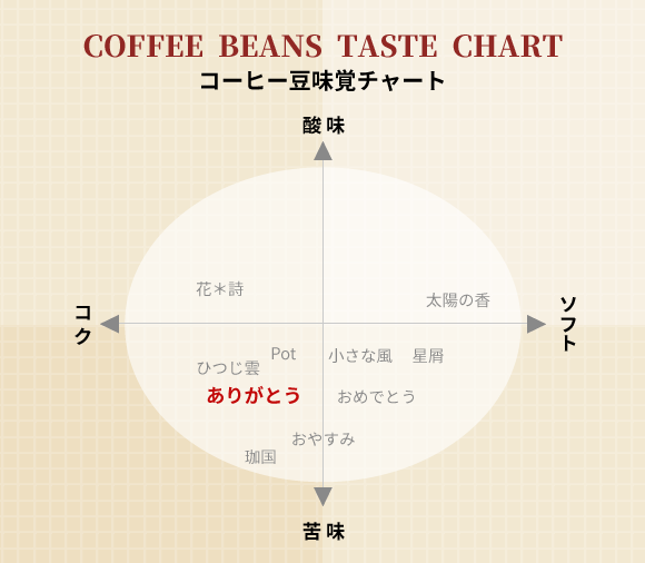 「ありがとう」というネーミングから、Beans Potでは、ちょっとしたお礼や母の日などの贈り物、お中元・お歳暮ギフトにもよくご利用頂き、また結婚式の引き出物にまで使って頂いているブレンドです。